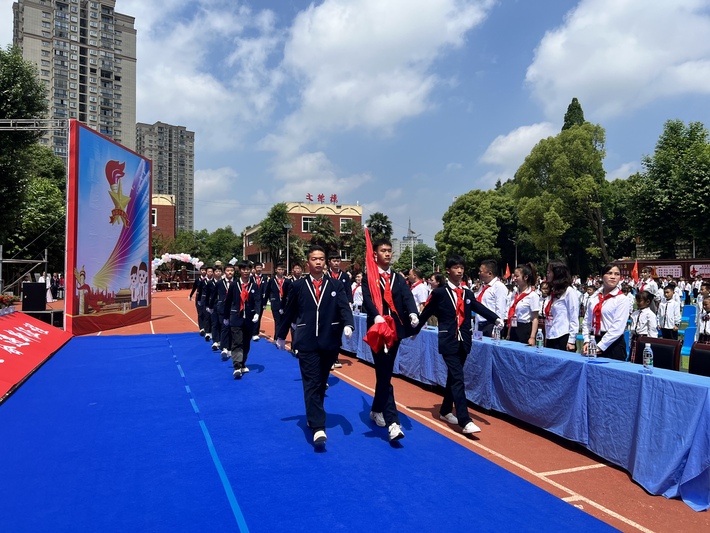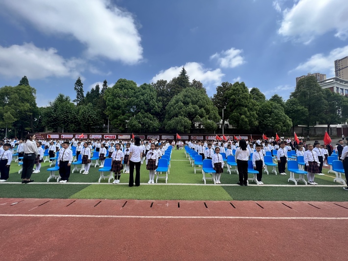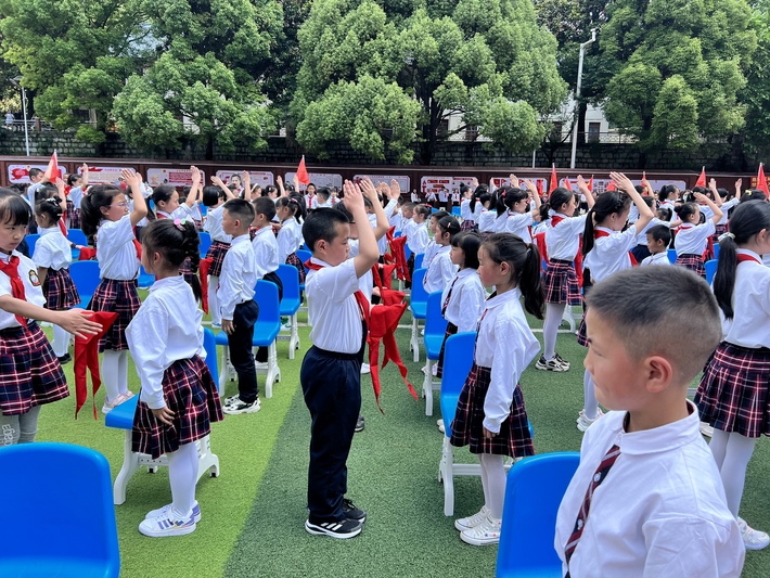 活动在雄壮的国歌声中拉开帷幕,出队旗,唱队歌,数百名少先队员和一年级小朋友参加了集体入队仪式。仪式中,新队员在队旗下庄严宣誓,老队员重温入队誓词,表达了新时代少先队员童心向党,传承红色基因,立志成长为社会主义合格建设者和接班人的信心和决心。