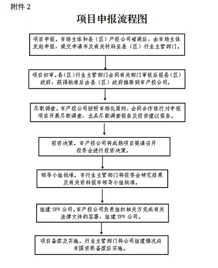 就如何进行项目申报,吴小岭告诉记者,首先由市场主体和县(区)产投公司进行磋商后,由市场主体发起申报。经县(区)行业主管部门会同有关部门审核后报县(区)政府,获得批准后由县(区)政府推荐到市产投公司。再由市产投公司按照市场化原则,会同合作银行对申报项目开展尽职调查,出具尽职调查报告及投资建议报告。市产投公司将拟投资项目提请投资决策委员会进行审定后,市行业主管部门将投资决策通过的项目上报市领导小组批准实施。市领导小组批准后市、县产投公司及时组建SPV产业项目公司,负责组织相关方完成有关法律文件的签署。最后,由行业主管部门将公司组建情况向市国资局备案后实施。