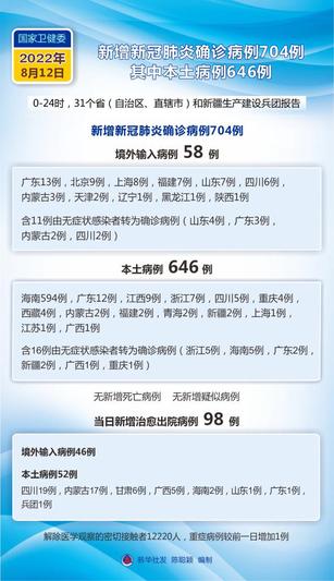 新华社北京8月13日电 国家卫生健康委员会8月13日通报,8月12日0—24时,31个省(自治区、直辖市)和新疆生产建设兵团报告新增确诊病例704例。其中境外输入病例58例(广东13例,北京9例,上海8例,福建7例,山东7例,四川6例,内蒙古3例,天津2例,辽宁1例,黑龙江1例,陕西1例),含11例由无症状感染者转为确诊病例(山东4例,广东3例,内蒙古2例,四川2例);本土病例646例(海南594例,广东12例,江西9例,浙江7例,四川5例,重庆4例,西藏4例,内蒙古2例,福建2例,青海2例,新疆2例,上海1例,江苏1例,广西1例),含16例由无症状感染者转为确诊病例(浙江5例,海南5例,广东2例,新疆2例,广西1例,重庆1例)。无新增死亡病例。无新增疑似病例。
