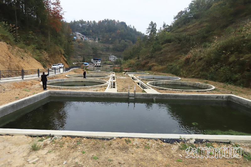 在小湾村,依托流淌的小溪流,水产养殖基地依水而建,只见两个大鱼塘和6个圆形小养殖池里,鱼儿欢快自由地游动。