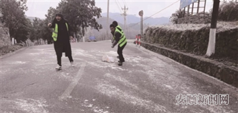 普定县普重线路段少量凝冻,工作人员铺撒融雪剂。