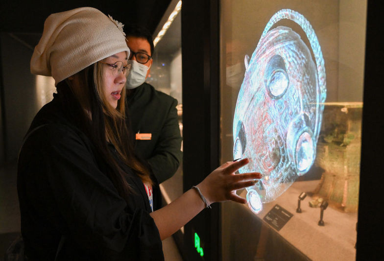 2023年9月15日,观众在位于北京奥林匹克公园核心区的中国考古博物馆内体验互动屏幕。新华社记者 李贺 摄