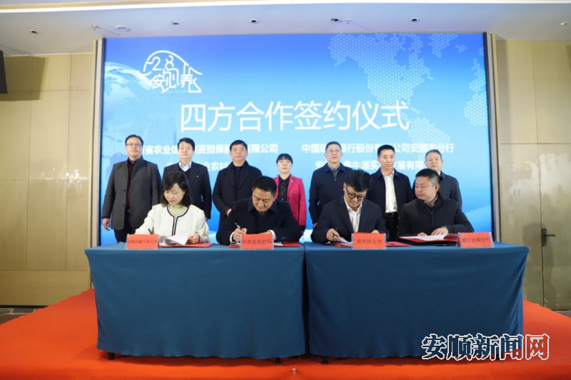 1月4日,省农业信贷融资担保股份有限公司、市农业农村局、中国建设银行安顺分行、安顺众鑫牛源实业发展有限公司在我市共同签订安顺市肉牛产业“28安心养”项目四方合作协议,副市长潘登岭出席签约仪式。