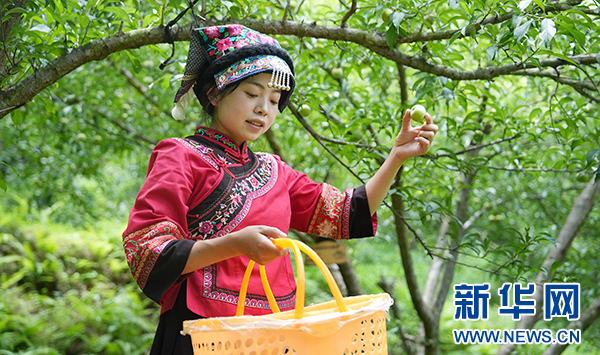 六马镇果农刘文飘在自家果园里采摘蜂糖李。新华网 卢志佳 摄