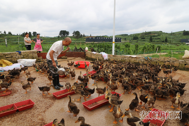 在农业共享庄园里,记者看见平坝区李光祥生物养殖场负责人李光祥正在把微生物菌剂放进饲料里搅拌,再分发到一个个食盒里,随着他的一声口哨吹响,四面八方的鸭子摇头摆尾地从田野间成群结队走回养殖基地,围着食盒吃起来。
