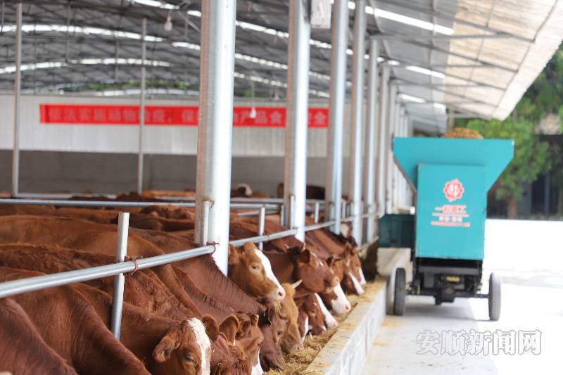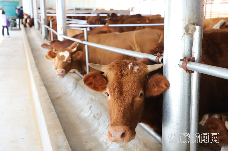 近日,记者走进位于安顺经开区幺铺镇的贵州聚福牛源养殖有限公司,看见一栋栋红墙黑瓦的房子,如同“别墅”一般映入眼帘,几台机械化饲喂车正在投喂种牛,膘肥体壮的牛儿低着头悠闲地咀嚼饲料。