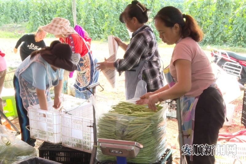 随后,记者来到新堡村另一片蔬菜基地,嫩绿饱满的豆子挂满了藤蔓,一排排豆架间,百余名村民正在采摘无筋豆,采摘、打包、搬运……一片忙碌的喜人景象。