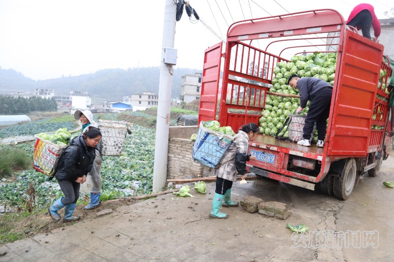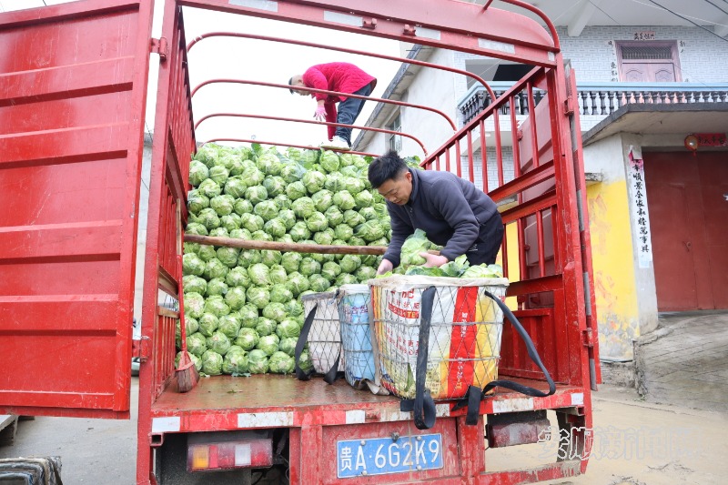 田埂边,贵阳客商正在给高诗刚家收购卷心菜。王老板一边装箱一边笑着说:“今天在这里准备收三四吨,现在卷心菜的单价是7毛钱,主要是运到贵阳销售。我们常年在这边收蔬菜,农户种什么,我们就收什么,这边的蔬菜品质很好,拉到贵阳去比较畅销。”