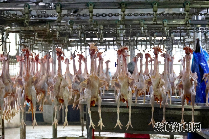 走进该公司屠宰加工区域,一只只活鸡被工人倒挂在生产机械上,顺着链条传送进室内进行宰杀、烫鸡、脱毛、拔腊、拔毛、肉品质检、净膛、内脏处理、清洗预冷等17道工序,整条屠宰加工流水线高效、安全、卫生,最后经过专业的检疫检验后进入市场。