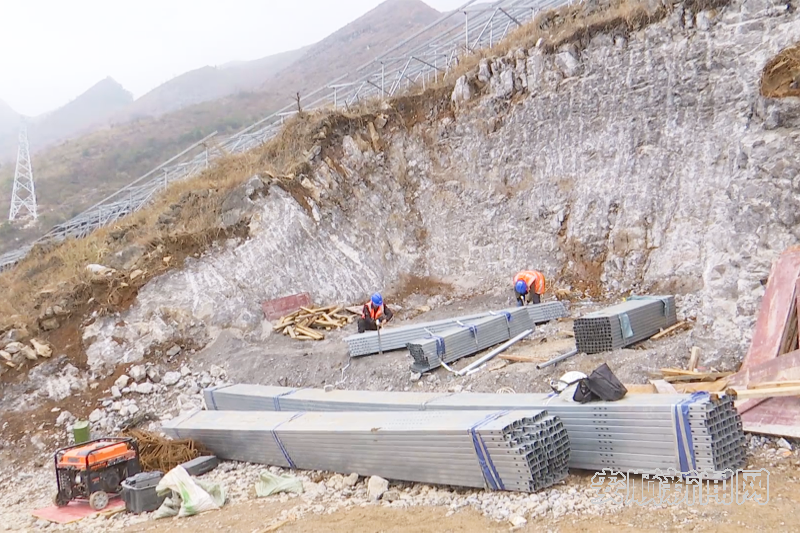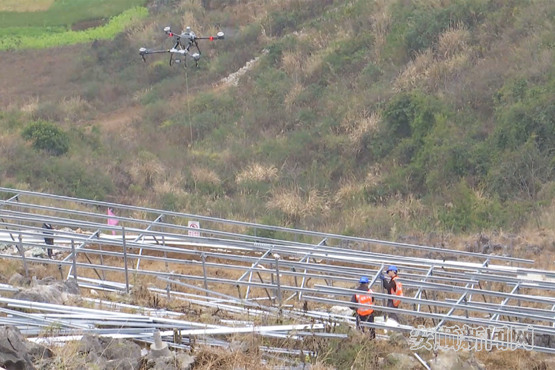 施工现场,数百名工人正在分工劳作,或除草打孔,或浇筑桩基,或安装支架及组件,大家各司其职,有条不紊地工作;“嗡嗡嗡……”另一侧,一名工作人员操作着无人机盘旋起飞,瞬间把机身下系着的绳子拉得笔直,绳子下端紧扣的光伏板也随之升空,一番飞行后,光伏板随着无人机缓缓下降,陡坡之上的两名施工人员扶板解扣,开始着手安装。