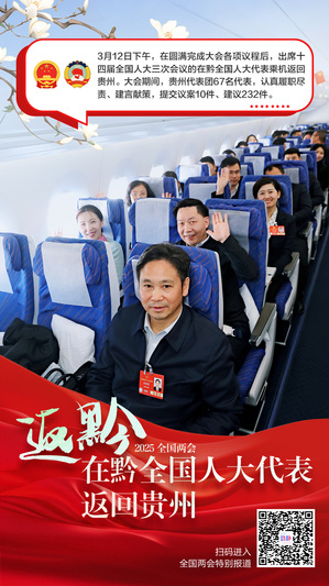 今天(3月12日)13:30,在圆满完成大会各项议程后,出席十四届全国人大三次会议的在黔全国人大代表乘机返回贵州。大会期间,贵州代表团67名代表,认真履职尽责、建言献策,提交议案10件、建议232件。