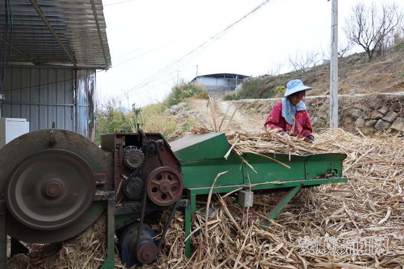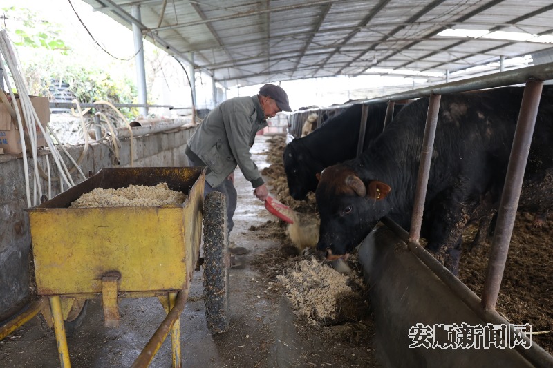 在关岭自治县新铺镇卧龙村和尚井组,当地养殖大户高诗波打算备些草料,特意请了两位村民到家里帮忙。青贮池上,揉丝机正肆意轰鸣,把株株干草吞入“腹”中一一揉碎,再喷洒进青贮池中堆积储藏;圈舍栏前,草料、玉米、酒糟等精料与粗料经过科学配比后被倒至食槽,引得牛儿们争相舔食。