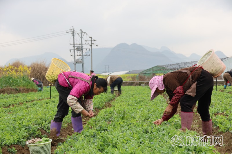 日前,走进普定县马官镇双玉村的种植基地,一片绿意盎然的景象映入眼帘。鲜嫩的豌豆尖在阳光的照耀下显得生机勃勃,数百亩田地内,60余名工人手法娴熟,小心翼翼地将一根根鲜嫩的豌豆尖摘下,放入筐中。