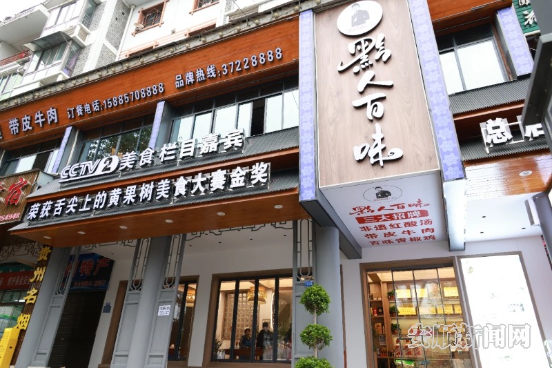 在黄果树新城广场,黔人百味新店面已装修完成,正式营业。开业以来,黔人百味的菜品深受游客喜爱,老板王小福告诉记者,为提升游客就餐舒适度、满意度,新店面扩大了总体面积,由原来的220平方增至450平方,装修风格上延续布依族文化,同时提供手绘景区游玩地图及相关攻略,让游客深切感受本地文化。