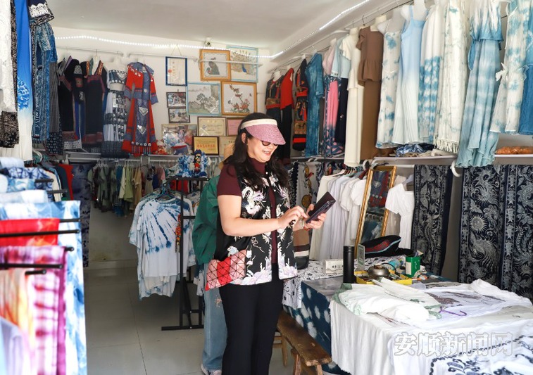 “早上刚从黄果树景区出来,在网上看到附近有个布依村寨,就想着过来看看,没想到这里的蜡染这么有特色。”吴女士的话语里透着惊喜,身后的展架上,旗袍、T恤、裙子等蜡染制品琳琅满目,在光影交错间诉说着石头寨布依族的手工艺故事。