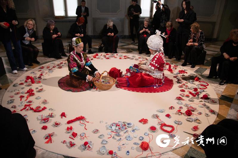 龙禄颖(左)在2025米兰时装周上向国际友人展示苗族绣艺