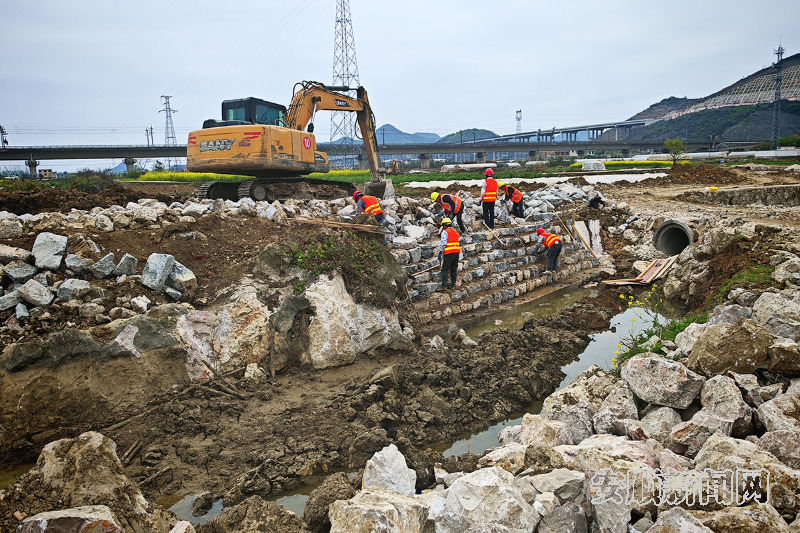 近日,记者来到平坝区2025年小河湾项目区小流域综合治理提质增效项目施工现场,只见大型机器正在忙碌地进行河道清理和材料运输,挖掘机与工人们紧密配合,加速进行河岸砌筑作业,现场一派繁忙景象。