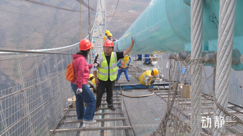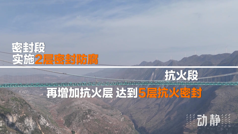 花江峡谷大桥主缆抗火防腐工程项目负责人邬惠娟说:“抗火层采用的是玄武岩纤维加工成基布,做成抗火隔热带,加入气凝胶,极大地提高了它的隔热性能;再外面是纤维阻燃密封胶带,与玄武岩纤维网格布组合在一起,形成一个高强度、高韧性、高耐候的密封层。而最外层的缠包带能够耐到1200℃的高温。”