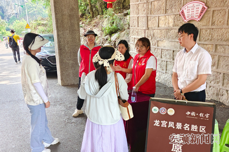 “五一”假期,龙宫景区热闹非凡。龙宫管理处组织30余名志愿者协助维护旅游秩序,为游客提供线路指引、旅游咨询与应急救援等服务。