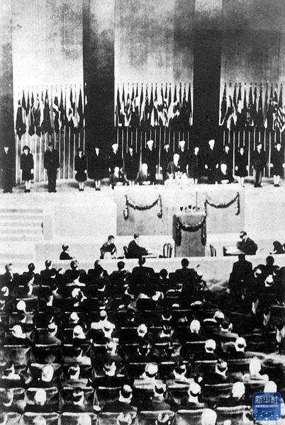 二战结束前后,国际社会作出的最重要决定就是成立联合国。1945年,来自50个国家的代表在美国旧金山召开了联合国国际组织会议,中国和苏联率先在《联合国宪章》上签字。同年10月24日,中、苏、法、英、美和其他多数签字国递交了批准书后,宪章开始生效,联合国正式成立。这是首届联合国会议的资料照片。