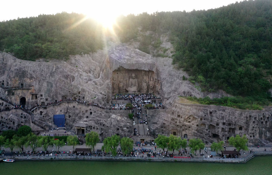 2025年4月24日,游客在龙门石窟游玩(无人机照片)。
