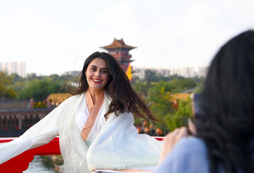 2023年2月28日,游客在洛阳洛邑古城游玩。洛邑古城精致的布景和各色表演吸引着众多游客。