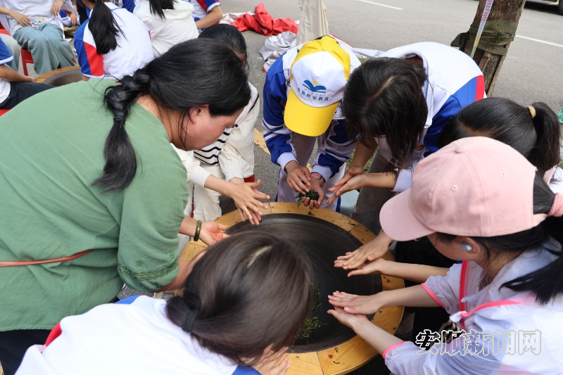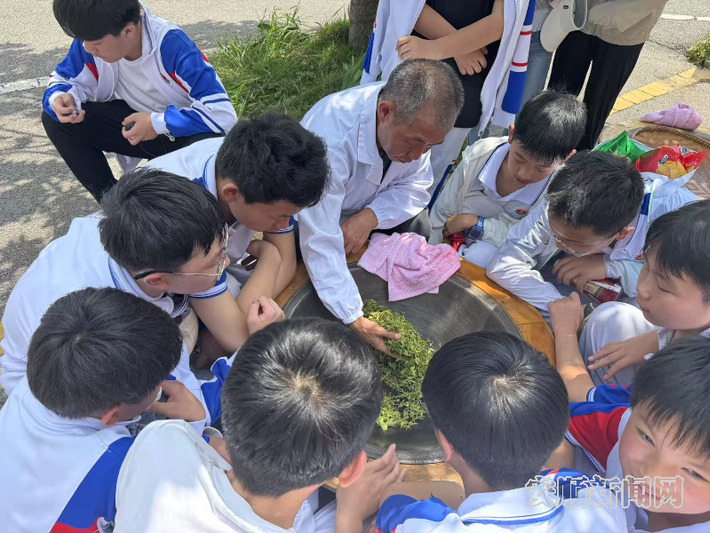 茶山上,学生们身着统一服装,手持竹篓,在翠绿的茶园间穿梭,认真学习采茶技巧。“采摘茶叶不能用指尖,而是要用指腹捏住茶树最顶端的一芽一叶,轻轻往上提,这样制作出来的茶叶才有良好的品相和口感。”在采茶师手把手的教学下,学生们逐渐掌握采茶技艺,碧绿的茶叶簌簌落入竹篓。