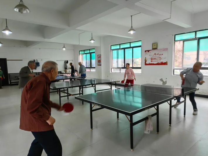 雅沐园社区新时代文明实践站健身活动室内,退休老人打乒乓球。