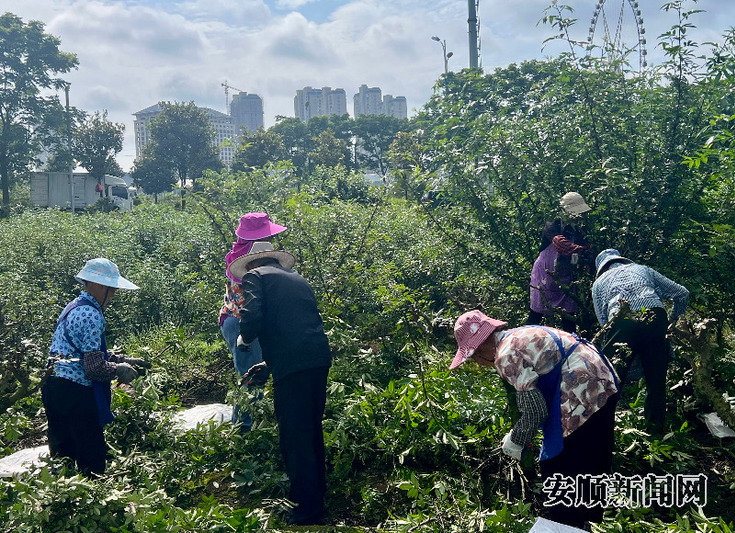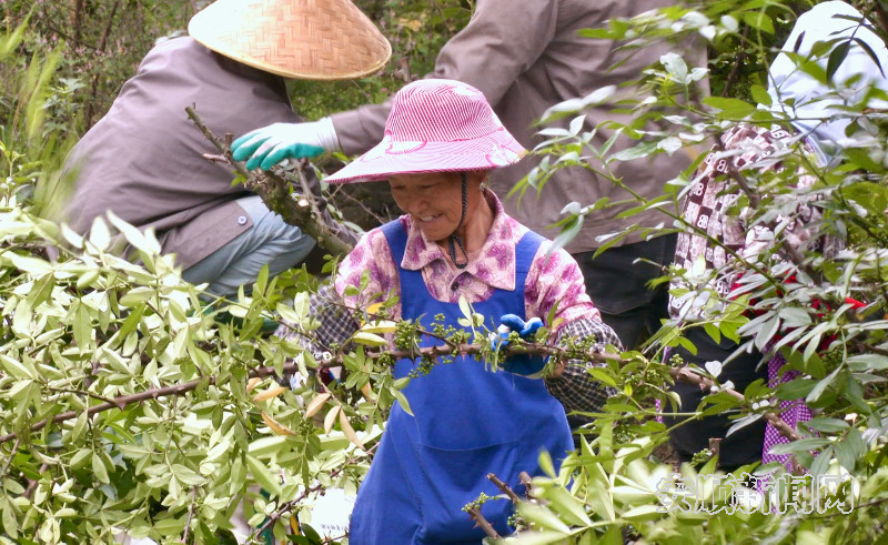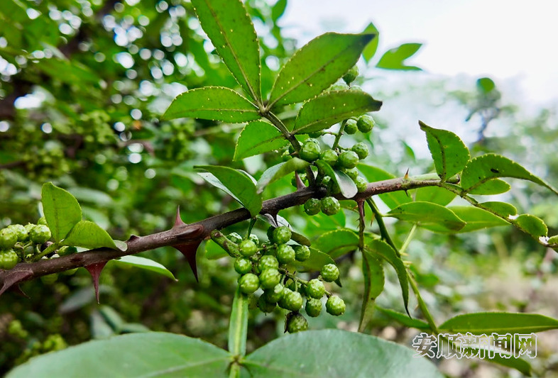仲夏时节,安顺经开区宋旗镇宋旗村的花椒园翠绿满园,枝头缀满沉甸甸的青花椒果实,工人们灵巧的指尖在枝叶间翻飞,剪枝、采收、脱粒……手指染上点点绿痕,箩筐渐渐充实,忙碌的身影与满园椒香交织成一幅丰收图景。