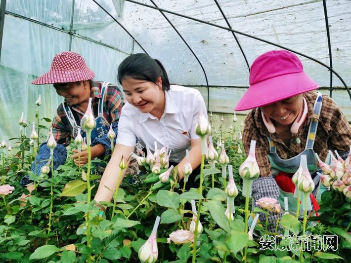 青山村党支部副书记周梅(中)与当地村民一起采摘玫瑰