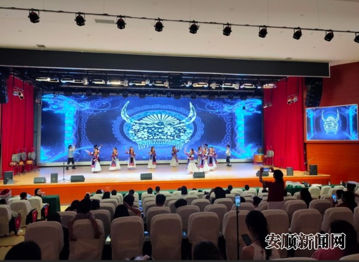 活动以镇宁非物质文化遗产布依族铜鼓十二调演绎拉开了序幕,在铜鼓伴奏下的《奢香夫人》将观众引到了镇宁的历史长河。活动第一环节是镇宁布依族第三土语区文化展演,表演了《布依族花苞舞》和布依族童谣《望月亮》,节目以声传情,将观众带进了镇宁布依族群众生产生活的幸福场景;活动第二环节是《镇宁印象》美术展,现场呈现了《镇宁果绘》《镇宁故事》《民饰琉光》三幅主题画作,以艺术视角诠释了镇宁的自然馈赠、人文积淀和民族风情;活动第三环节是情景朗诵,通过红色故事“弄染结盟”、长征板袍、简嘎纳孝、古榕树等故事,生动再现革命精神与乡土记忆。最后学生朗诵的《镇宁:时光酿成的蜜》将活动推向了高潮,朗诵者娓娓道来,绘声绘色朗诵“甜蜜镇宁是我永远的骄傲,我要做那个最热情的代言人”迎来了满堂掌声。