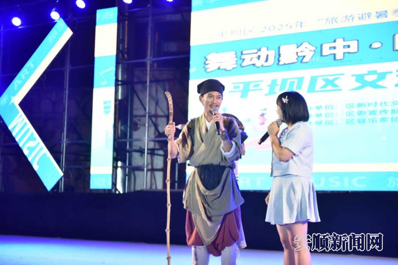 除了浓浓的文化味外,本次展演活动高潮当属贵州文旅推介官明超的精彩推介环节。凭借对平坝的真挚热爱,在短视频创作平台拥有百万粉丝的明超通过展演现场实时推介平坝的避暑魅力。他特别推荐了多条避暑旅游路线,涵盖平坝自然风光与人文风情,并分享了实用旅行贴士。