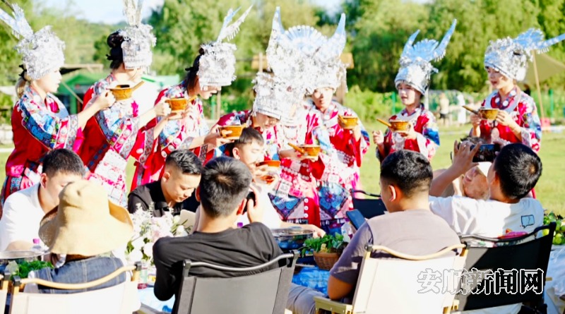 活动现场,安顺非遗地戏表演点燃气氛,独特的唱腔与精湛的表演,让观众沉浸式感受地方传统文化魅力。酸汤长桌宴随后登场,游客们围坐长桌,品尝以贵州酸汤为汤底的特色佳肴。新鲜的黄牛肉、黄辣丁等食材在酸汤中翻滚,吸收醇厚鲜香,令人赞不绝口。长桌宴上的