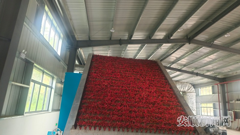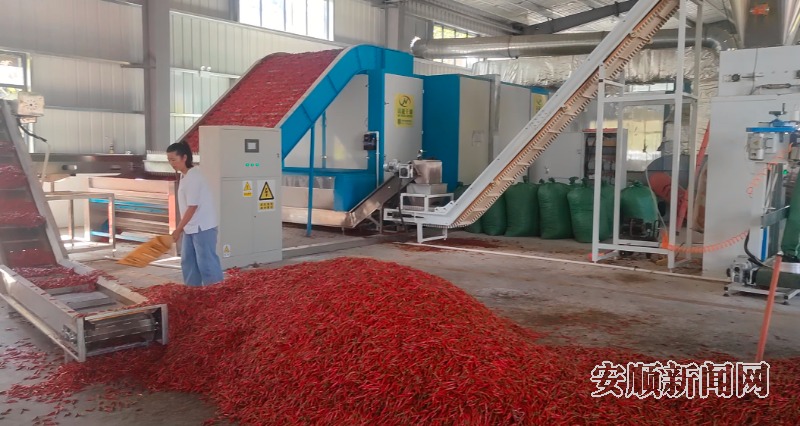 秋风送爽,椒香四溢。走进紫云自治县猴场镇小湾村的辣椒加工厂,机声轰鸣,自动化烘烤加工生产线高速运转,工人们正有序将一筐筐鲜红的辣椒送入生产线,经过去杂、去柄、烘烤、分选等工序后,一袋袋色泽鲜亮的干辣椒整齐码放,等待发往市场。