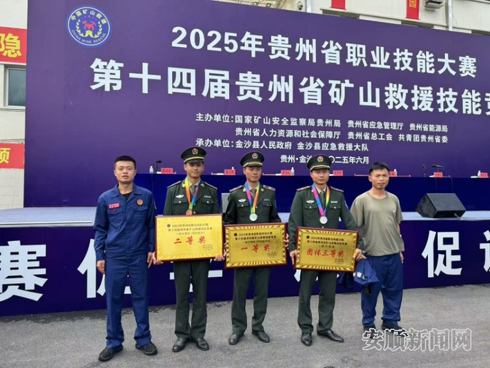 日前,由国家矿山安全监察局贵州局、省应急厅、省能源局、省人社厅、省总工会等部门联合主办的2025年贵州省职业技能大赛一一第十四届贵州省矿山救援技能竞赛在毕节市金沙县成功举办。来自全省煤矿及非煤矿山46支矿山救援队伍围绕模拟救灾、医疗救急等项目展开比拼。国家矿山应急救援安顺队作为安顺市唯一一支参赛队伍,在比赛中勇创佳绩,在竞赛项目中以精湛的技能、顽强的作风和团结协作的精神,荣获团体三等奖、呼吸器团体一等奖、个人全能全省第9名、理论三等奖一名 、体能二三等奖两名、呼吸器操作三等奖三名等多项奖项。