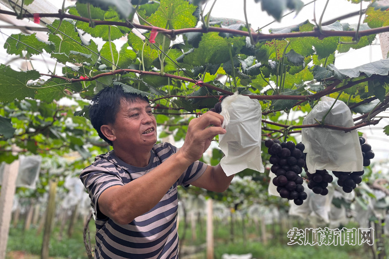 初秋时节,在平坝区乐平镇的葡萄园里,一串串饱满多汁的葡萄挂满枝头。