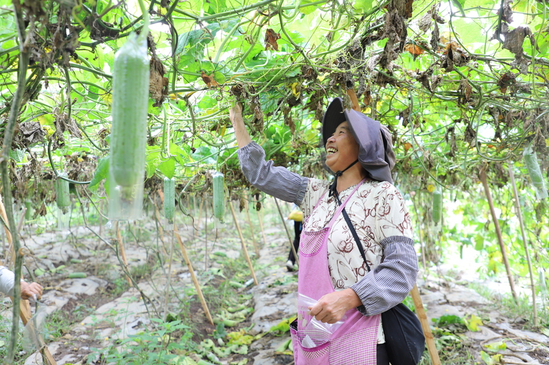 在不远处的丝瓜田里,套袋作业正如火如荼。村民们手持透气纸袋,熟练地为翠绿的丝瓜“穿”上防护衣,透明的袋子在藤蔓间错落分布,成为守护丝瓜品质的“小屏障”。“现在正是丝瓜套袋的关键期,套了袋能防病虫害、防日晒,还能保证瓜身光滑,卖相好。”罗晓娜坦言,今年茄子和丝瓜的行情不算理想,收购价比去年略低一些,但好在两种作物的产期长,“能一直采摘到11月底,还有两个多月的采收期,蔬菜价格本来就波动大,时好时坏,咱们再等等,后期说不定就能卖个好价钱。”话语间,难掩对作物丰产的信心。