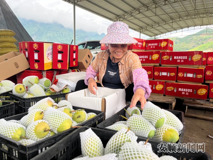 镇宁自治县六马镇纳建村3000亩芒果迎来丰收,果农正在分拣中心内打包芒果。 □记者 詹艳 摄