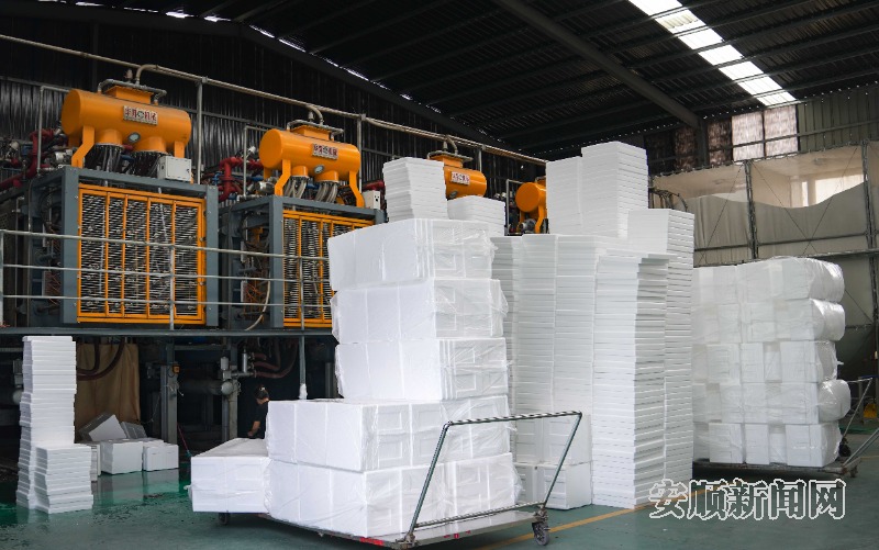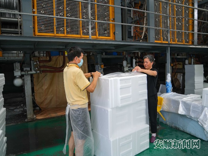在贵州浩芳科技有限公司的泡沫箱生产车间内,高温熔融的聚苯乙烯颗粒经蒸汽压膜,30秒即膨胀为标准箱体。“我们生产2号箱能装30斤辣椒,3号箱能装40斤茄子,以及其他6种规格的箱体,日产能约8000个。”该公司管理员宋龙银指向整齐码放的泡沫箱说道,“我们此前经过实地考察,了解到天龙镇及周边蔬菜种植产销产业基础较为完善,而市场对包装箱的需求巨大,因此便将生产车间建在坝区附近。现公司生产的产品有80%在区域内销售,其余20%则辐射到普定、六枝、关岭等周边县区。”