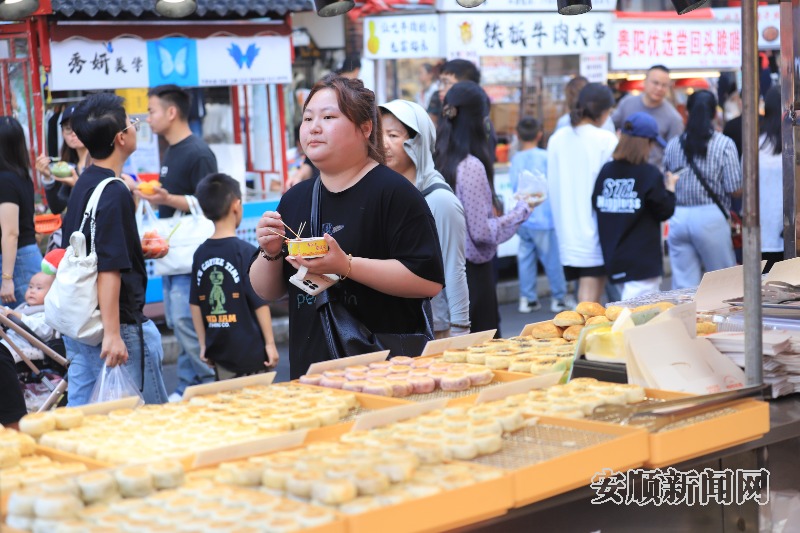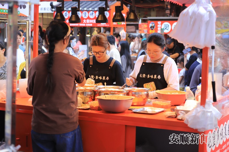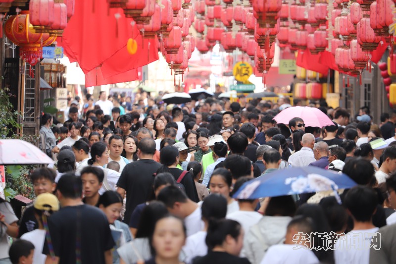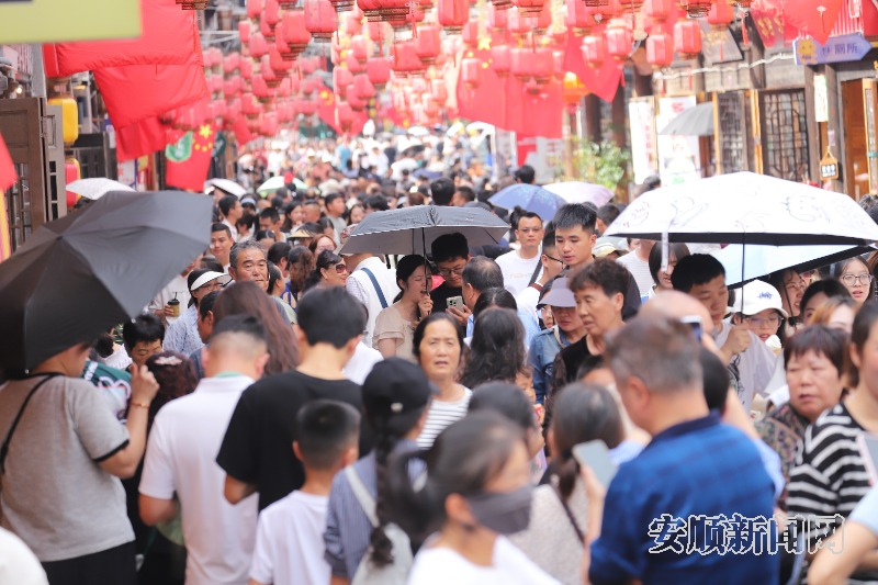 国庆期间,安顺古城人气旺,游客们逛古城、品美食,古城里游人如织。图为10月5日拍摄的古镇游客爆棚场景。