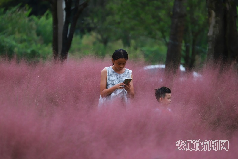国庆期间,虹山公园内,成片的粉黛乱子草吸引众多游客前来观赏游玩打卡。图为10月5日,
