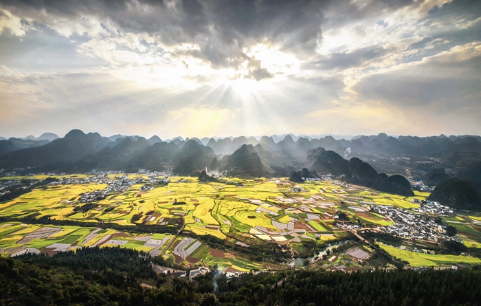 万峰林八卦田是万峰林景区内一处著名的景点,平卧在纳灰寨农田中央,其造型神奇迷离,如神匠打造,层叠有序。八卦田中有三个天然地漏,深不见底,被称为地眼——大地的眼睛。秋日里,万峰林层岭叠翠、稻田金黄,在日落余晖的照耀下,呈现一幅恬静的田园美景。而日落万峰林八卦田被众多摄友称为“中国最唯美秋景之一”。