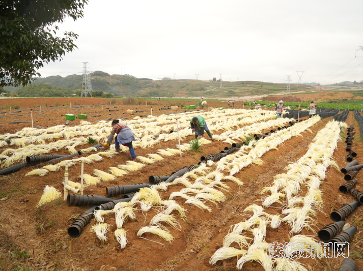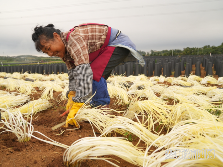 “今天采收的是今年的第一茬韭黄,预计能收割1万斤左右。目前工人的用工量比较大,收割加上清洗场每天需要70人左右。”贵州韭屹农业有限公司销售经理李文艳说。