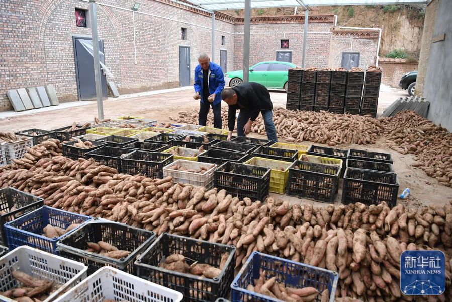 ↑ 10月16日,延安市宝塔区甘谷驿镇罗家湾村村民在整理收获的红薯。新华社记者 邵瑞 摄