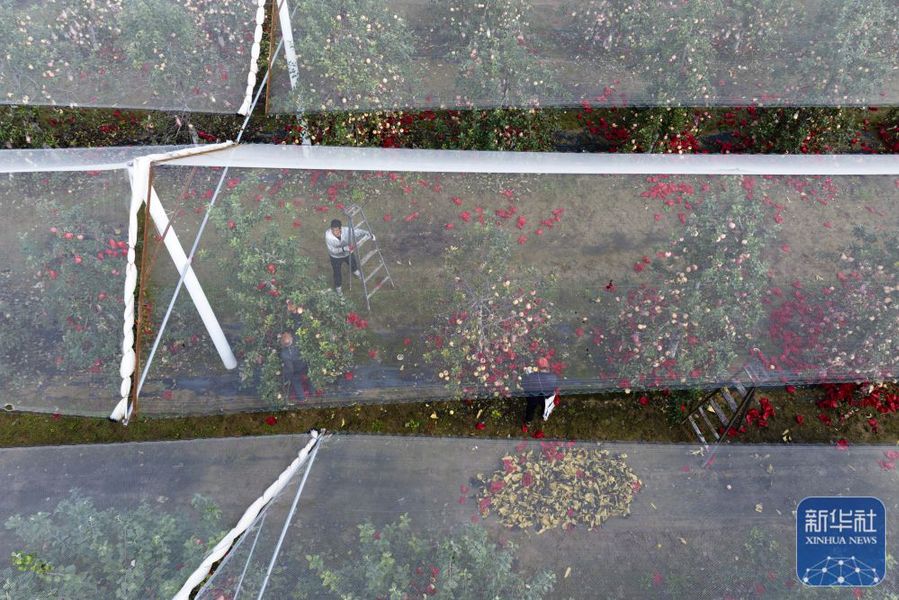 ↑ 10月17日,果农在延安市宝塔区桥沟街道烟洞沟村苹果园内摘掉苹果套袋(无人机照片)。新华社记者 邵瑞 摄