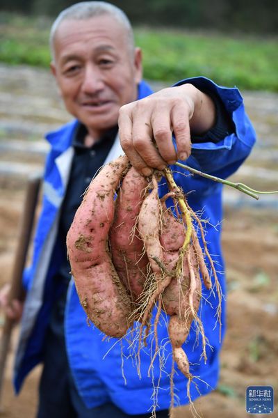 ↑ 10月16日,延安市宝塔区甘谷驿镇罗家湾村村民罗维阳展示收获的红薯。新华社记者 邵瑞 摄