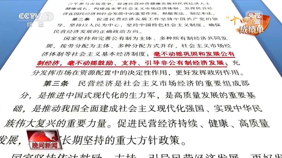 今年5月20日,民营经济促进法正式实施,共26处使用“平等”“公平”“同等”的表述,首次将坚持“两个毫不动摇”写入法律,促进多种所有制经济共同发展。
