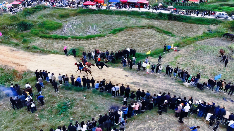 赛道上,裁判员一声令下,骑手扬鞭策马,如离弦之箭冲向赛道。马儿们你追我赶,驰骋于天然赛道,为现场观众带来水族独有的速度与激情。赛道两侧田埂上,观众助威呐喊声此起彼伏,整个赛马活动高潮迭起、热闹非凡。
