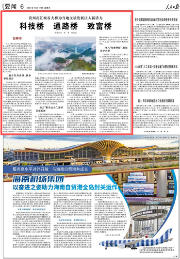 今天(12月12日),《人民日报》刊发新闻《贵州花江峡谷大桥为当地文旅发展注入新活力 科技桥通路桥致富桥(探访)》。