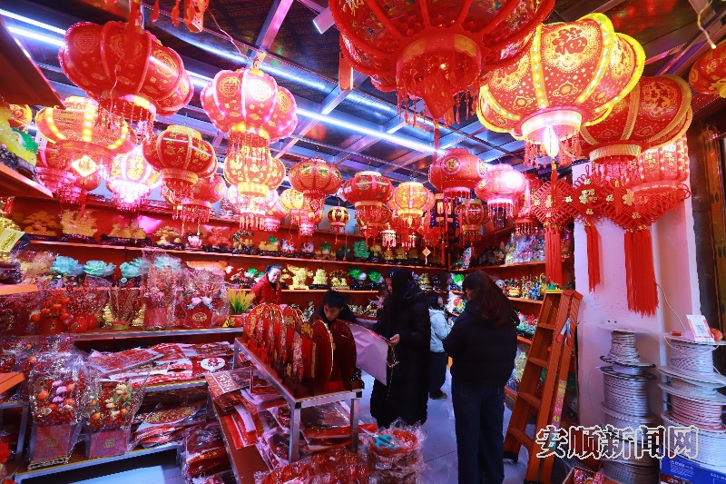 春节临近,我市各大年货市场热闹非凡,琳琅满目的商品吸引众多市民前来选购。图为1月26日,市民在城区小商品批发市场选购灯笼、挂饰、对联等新年饰品。